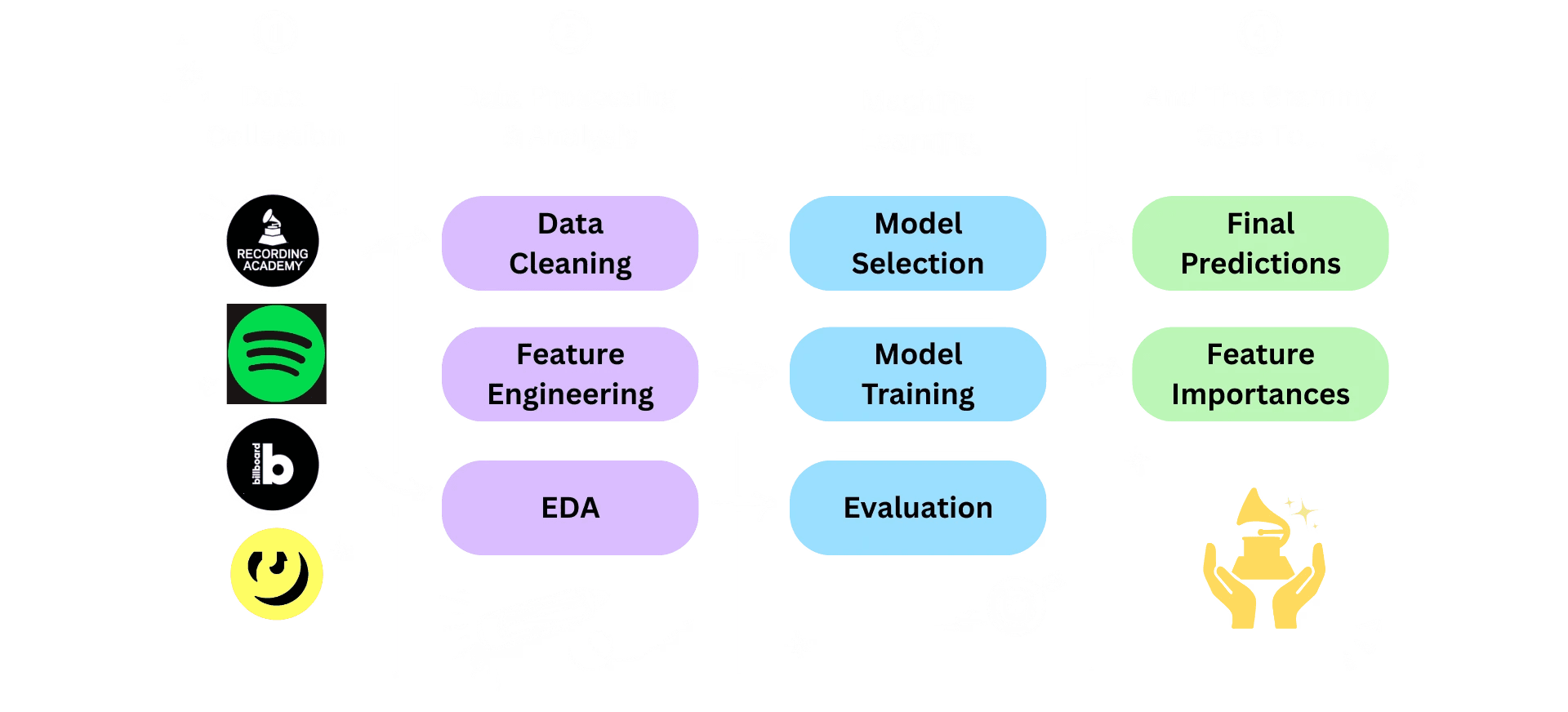 I built a full pipeline from data collection and cleaning to model training and evaluation, drawing on audio features, Billboard chart performance, and Genius lyrics across three categories: Song of the Year, Record of the Year, and Best Rap Song.